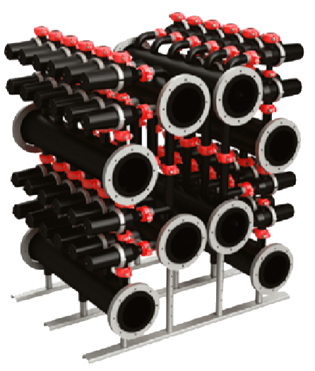 Система серии High Flow V используется в установках высокой производительности. Фильтры расположены горизонтально с обеих сторон модуля. Режим промывки фильтров программируется на щите управления по разнице давлений или/и по времени. Промывка фильтров осуществляется помодульно через общий коллектор (на одном модуле несколько фильтров). За счет наличия отдельных коллекторов на каждом фильтрующем модуле, возможна раздельная промывка модулей с использованием воды из внешних источников. Системы могут быть укомплектованы дополнительными опциями.