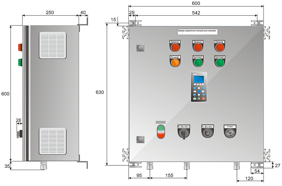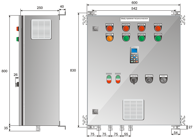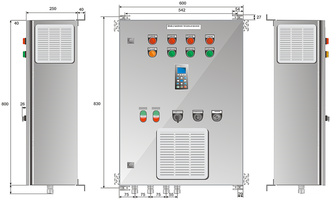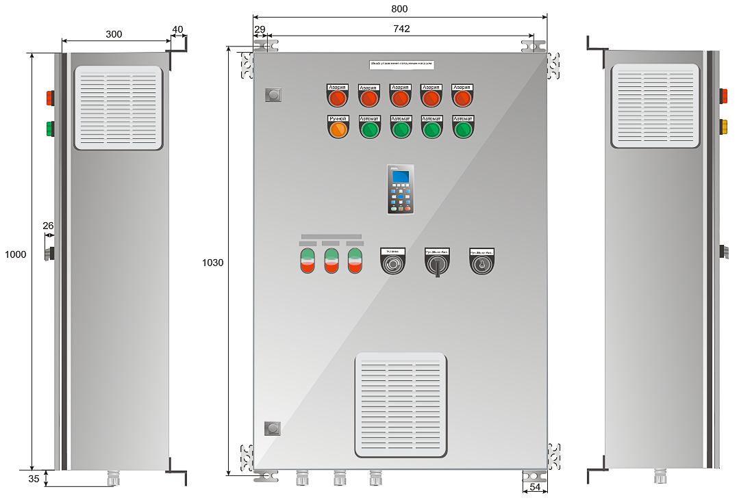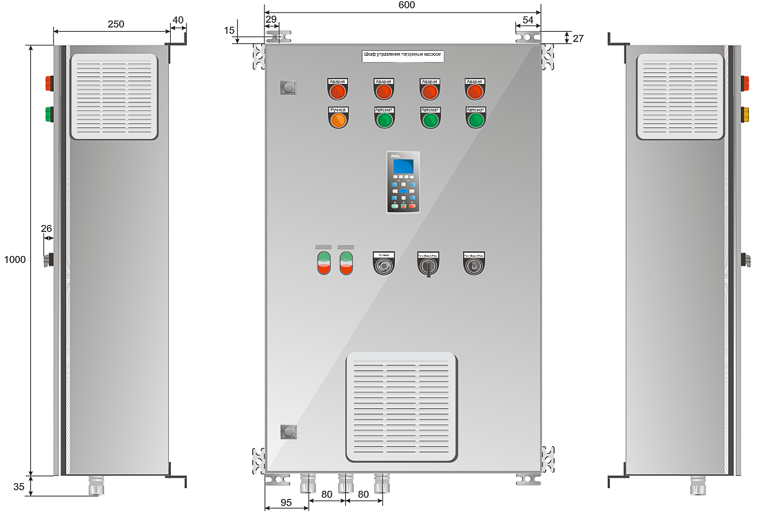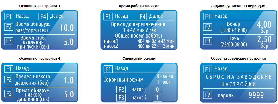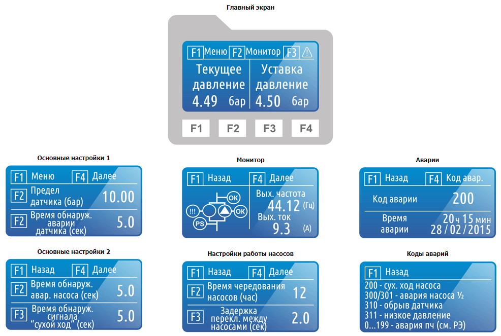 Информацию о текущем состоянии работы насосов, текущем давлении в напорном трубопроводе, времени наработки, состоянии аварийных датчиков и прочего можно увидеть на операторской панели. Встроенный журнал последних аварийных ситуаций позволит правильно проанализировать состояние системы до отключения.