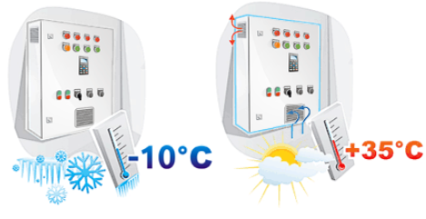 Это позволяет использовать шкаф внутри помещений при температурах до 35 °C в летнее время, а также в не отапливаемых помещениях зимой при температурах до минус 10 °C.