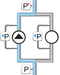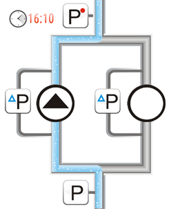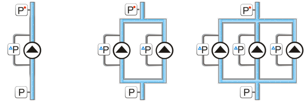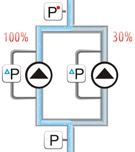 При повышенном расходе системы происходит переключение основного насоса «напрямую» к сети, затем производится плавный запуск и последующее регулирование пиковым насосом