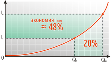 - Изменение производительности насоса позволяет изменять потребляемую мощность. Например, при уменьшении разбора воды (Q) на 20 % KIRSER 101 позволит снизить потребляемый ток на 48 % и при этом обеспечит необходимое давление в системе.
