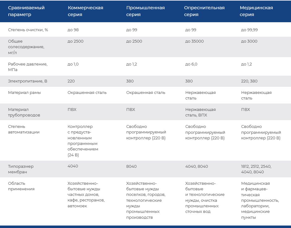 1. Высокое качество очищенной воды благодаря тонкопленочным мембранам ведущих мировых производителей. 2. Непрерывный контроль качества питающей (опция) и очищенной воды при помощи встроенных датчиков электропроводности. 3. Испытанные насосы лучших брендов гарантируют безотказную работу системы в тяжелых условиях эксплуатации «на износ» без снижения производительности. 4. Автоматический контроллер работы системы с защитой от «сухого хода», превышения давления и электропроводности.